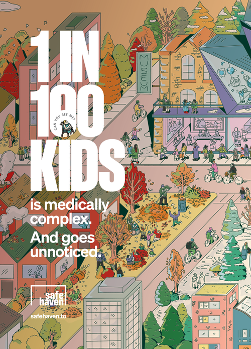 One in 100 kids in Canada is medically complex, and unfortunately, goes unnoticed. We needed people to take notice and to care about Safehaven's mission to support medically complex children. So, we made a book in the classic 'seek and find' illustration style that parents could read with their own children.